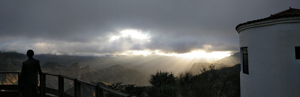 Una niña le coloca una mascarilla a Miguel de Unamuno. A la estatua de Miguel de Unamuno. Sus padres ríen, consienten. Es un signo de los tiempos. Quizás Unamuno habría reído también, aun quejumbroso. Se habría dejado, azul y quijotescamente, enmascarar por esta niña, a la que le quedan unos cuantos años para saber quién es Miguel de Unamuno. Se pone de puntillas, tiene que alzarse mucho para alcanzar los altos y tiesos bigotes de hierro. No hay apenas nadie más en este mirador, en este balcón, en esta vieja tarde de domingo en Artenara. El pueblo más alto y el menos habitado de la isla de Gran Canaria, que el escritor visitó en 1910. Mil doscientos setenta metros sobre el mar Atlántico, mil canarios que todavía hacen vida calma y esparcida por el monte. Algunas casas se abrigan en la ladera, donde las cuevas son, oscuro y al fondo, un cuarto más del hogar. Hace frío, es noviembre, es la cumbre, es la cercanía del Pico de las Nieves, es el cielo incoloro de un otoño templado, son los vientos alisios y contralisios. Es Unamuno impertérrito, eterno y contemplativo, y una niña que juega con la escultura, los siglos, el vértigo y la historia. Desde lo alto del barranco amarillo, el paisaje impone, hieratiza, hipnotiza, estatúa. Una inmensa cantera coronada de «roques enhiestos». El Roque Nublo y el Bentayga, el del Camello, y las Cuevas del Rey, y la Mesa del Junquillo y de Acusa, y a lo lejos las montañas de Altavista. Colinas peladas con apenas una cresta de pinos. La sensación de un valle de terciopelo cetrino, de suave tacto animal, de mano humana pasando por la testuz de un anciano perro dormido. Un trasquilón de carretera blanca y sedienta termina de pelar la montaña. Desde este borde del precipicio todo es una «tempestad petrificada, pero una tempestad de fuego, de lava, más que de agua», dejó dicho Unamuno, dejó mudo al maestro, de roca, de roque nublo, de hielo y dendrita, al desterrado y melancólico rector de Salamanca. Y ahí sigue, cada tarde, cada mañana, bajo el relámpago de sol dorado de este domingo, dejándose convencer y vencer por la niña empinada y sonriente, que abre la mascarilla entre sus manos como un muelle y le tapa la boca a quien dijo que este rincón de la isla semeja a «las calderas del Infierno» de Dante. Ante gesto tan inocente, como cuentan que le hacía a sus nietos mediante el arte de la papiroflexia, Unamuno le habría devuelto la mascarilla a la niña pero en forma de pajarita. Libre, sin atadura de alientos. Perfecta ante el abismo.